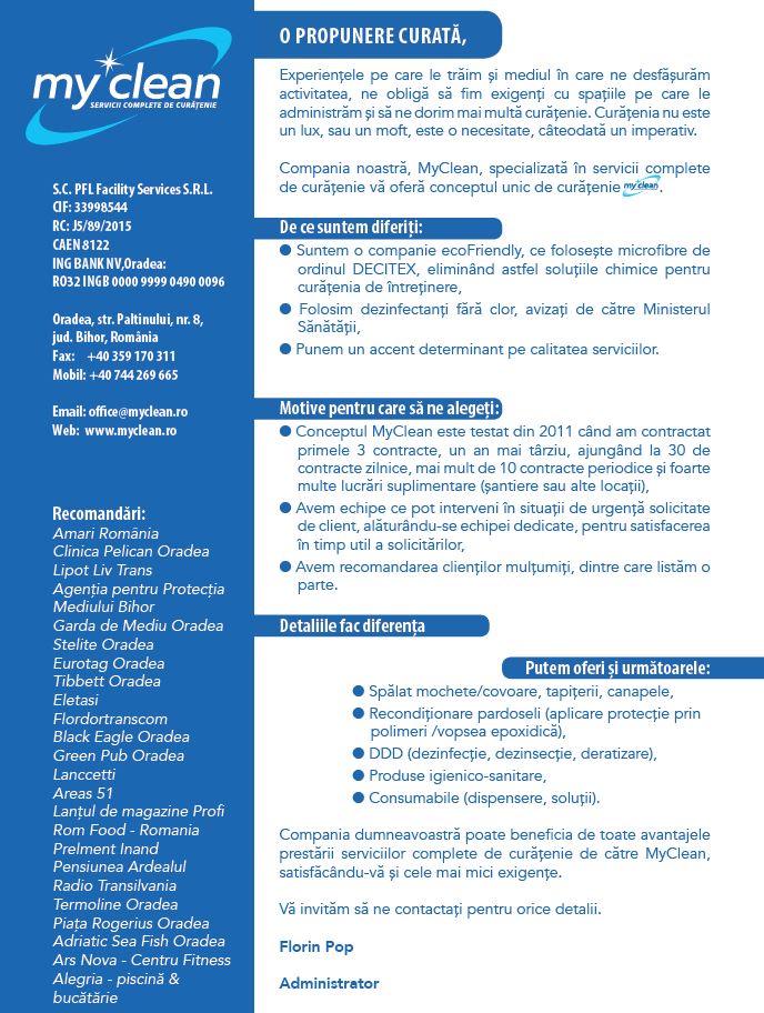 MyClean este o firmă autorizată în servicii specializate de curățenie cu o experiență pe piața din Oradea de peste 5 ani, din care 3 prin franciză și din 2015 performând prin conceptul unic MyClean, creat și dedicat cerințelor pieței din Oradea și nu numai.